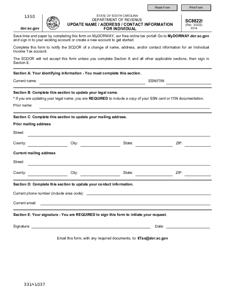 Reset Form STATE OF SOUTH CAROLINA1350 for.SC.covering FormDEPARTMENT OF REVENUESC8822IUPDATE NAME / ADDRESS / CONTACT INFORMATION FOR INDIVIDUAL(Rev. 3/3/22) 3314Save time and paper by completing