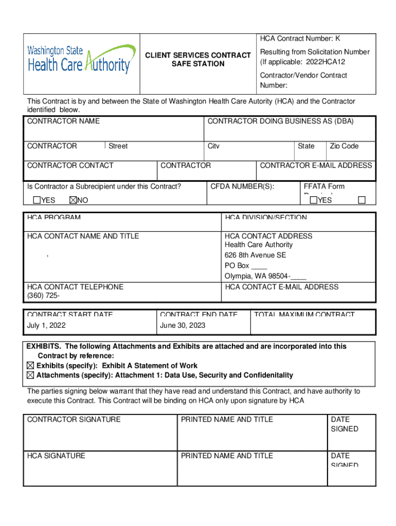 HCA Contract Number: K CLIENT SERVICES CONTRACT SAFE STATIONResulting from Solicitation Number (If applicable: 2022HCA12 Contractor/Vendor Contract Number:This Contract is by and between the State