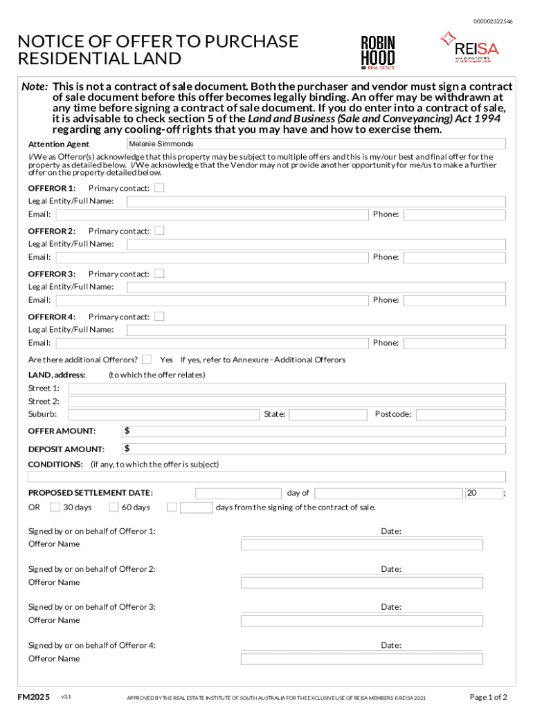 000002322546NOTICE OF OFFER TO PURCHASE RESIDENTIAL LAND Note: This is not a contract of sale document. Both the purchaser and vendor must sign a contract of sale document before this offer becomes