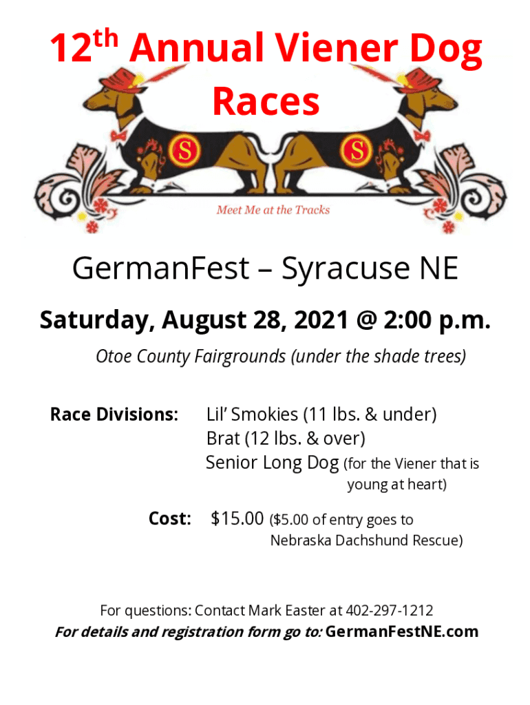 Th12 Annual Vainer Dog RacesGermanFest Syracuse NE Saturday, August 28, 2021 @ 2:00 p.m. Otoe County Fairgrounds (under the shade trees) Race Divisions:Little Smokes (11 lbs. & under) Brat (12 lbs.