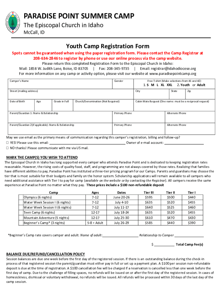 PARADISE POINT SUMMER CAMP The Episcopal Church in Idaho McCall, Youth Camp Registration Form Spots cannot be guaranteed when using the paper registration form. Please contact the Camp Registrar at