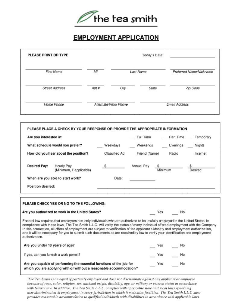 EMPLOYMENT APPLICATION Today's Date:PLEASE PRINT OR Typecast NameMIStreet Address #Home Phones NameCityPreferred Name/NicknameStateZip CodeAlternate/Work Phonemic AddressPLEASE PLACE A CHECK BY YOUR