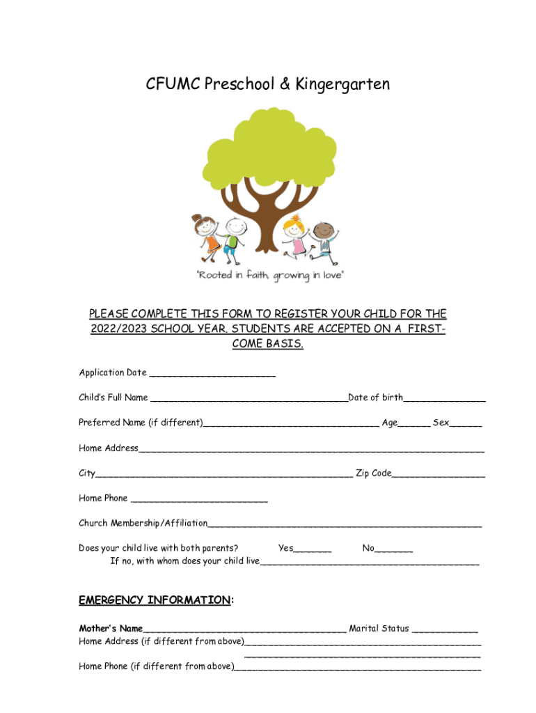 CFU MC Preschool & KingergartenPLEASE COMPLETE THIS FORM TO REGISTER YOUR CHILD FOR THE 2022/2023 SCHOOL YEAR. STUDENTS ARE ACCEPTED ON A FIRSTBORN BASIS. Application Date ___ Child's Full Name ___Date
