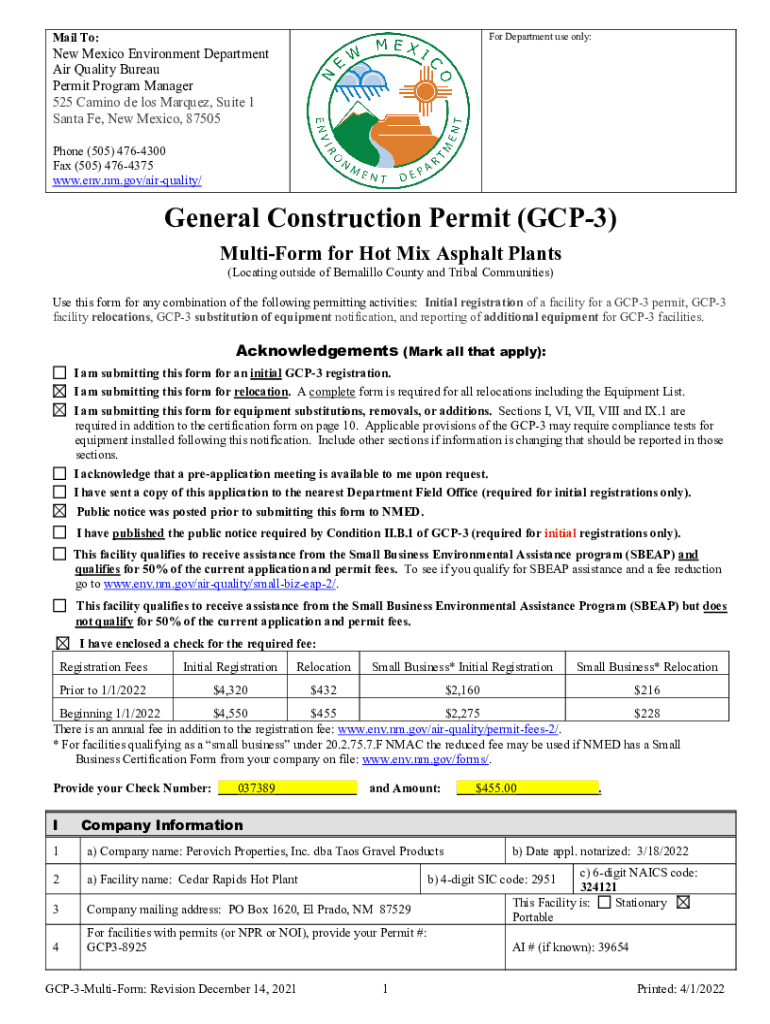 Mail To:For Department use only:New Mexico Environment Department Air Quality Bureau Permit Program Manager 525 Camino de los Marquez, Suite 1 Santa Fe, New Mexico, 87505 Phone (505) 4764300 Fax (505)