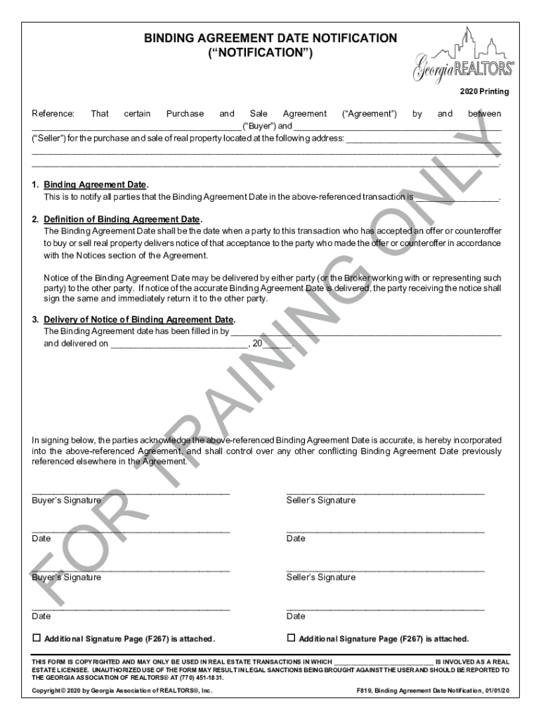 BINDING AGREEMENT DATE NOTIFICATION (NOTIFICATION)Georgia2020 Printing N Reference: That certain Purchase and Sale Agreement (Agreement) by and between ___ (Buyer) and ___ (Seller) for the purchase