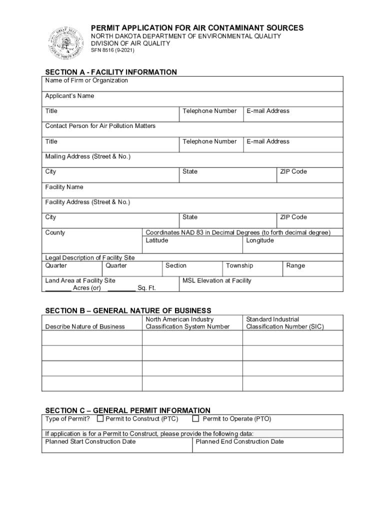 PERMIT APPLICATION FOR AIR CONTAMINANT SOURCES NORTH DAKOTA DEPARTMENT OF ENVIRONMENTAL QUALITY DIVISION OF AIR QUALITY SON 8516 (92021)SECTION A FACILITY INFORMATION Name of Firm or Organization