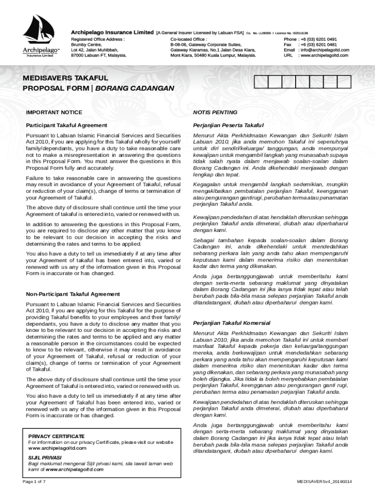 MEDIATES TAKAFULProposal Form | Boring CadanganIMPORTANT NOTICENOTIS PENTINGParticipant Tactful AgreementPerjanjian Peseta TakafulPursuant to Laban Islamic Financial Services and Securities Act 2010,