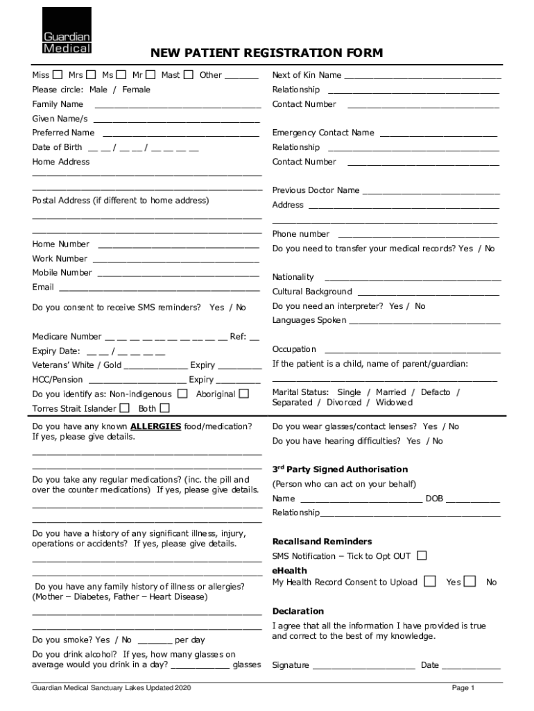 NEW PATIENT REGISTRATION FORM MissMrsMsMrMastOther ___Next of Kin Name ___Please circle: Male / FemaleRelationship ___Family Recontact Number______Given Name/s ___ Preferred Name ___Emergency Contact