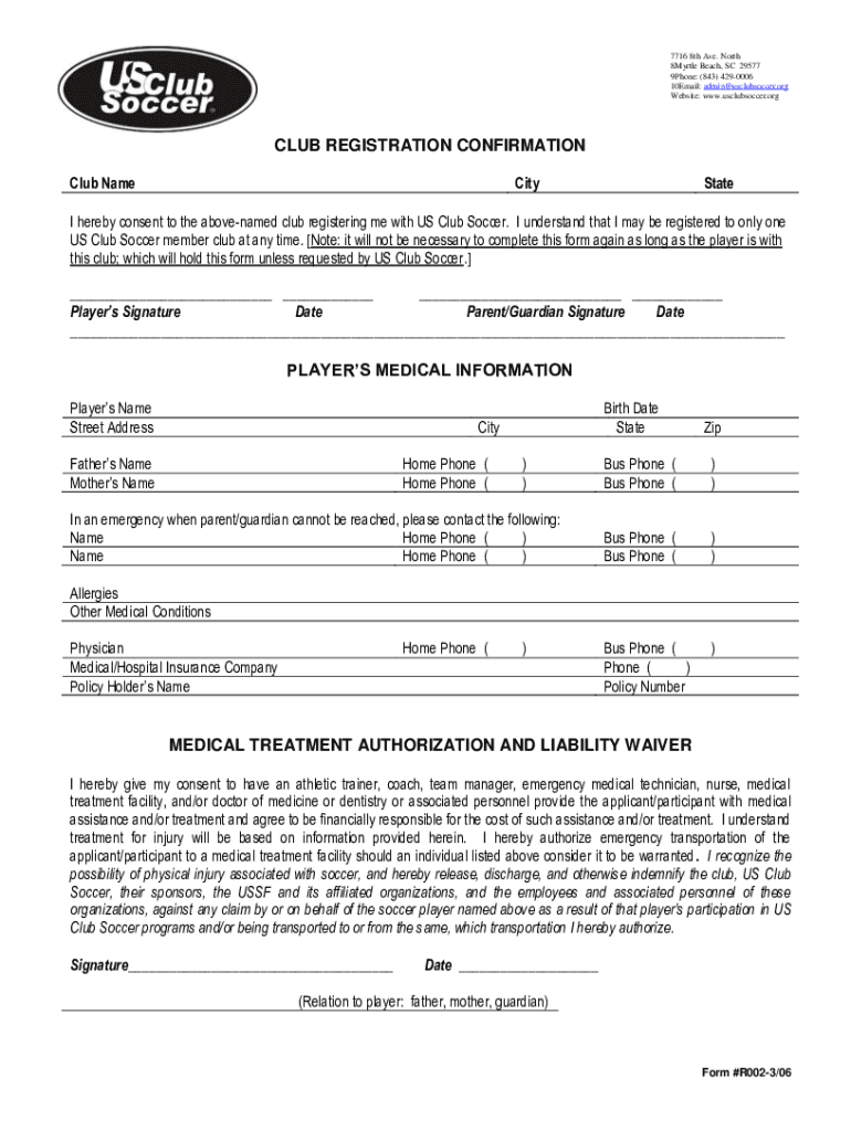 7716 8th Ave. North 8Myrtle Beach, SC 29577 9Phone: (843) 4290006 10Email: admin@usclubsoccer.org Website: www.usclubsoccer.orgCLUB REGISTRATION CONFIRMATION Club NameCityStateI hereby consent to