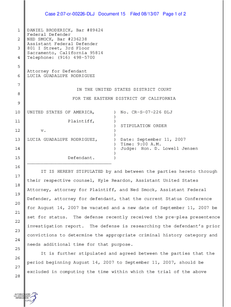 Case 2:07cr00226DLJ Document 151 2 3 4Filed 08/13/07-Page 1 of 2DANIEL BRODERICK, Bar #89424 Federal Defender NED SMOCK, Bar #236238 Assistant Federal Defender 801 I Street, 3rd Floor Sacramento,