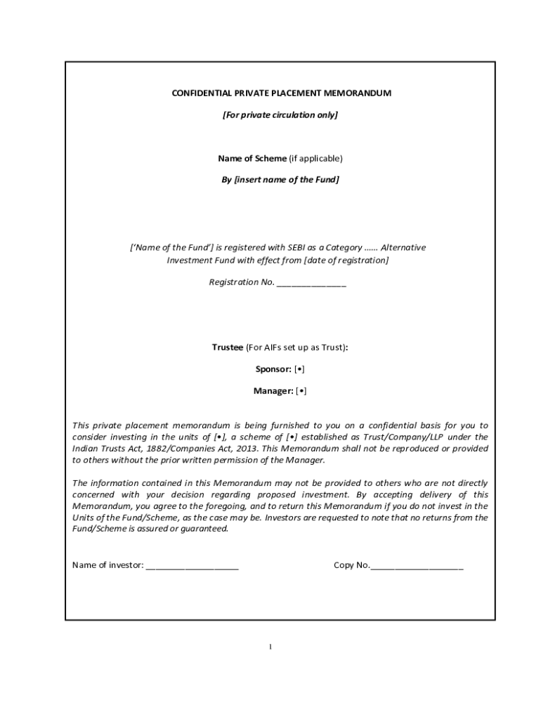 CONFIDENTIAL PRIVATE PLACEMENT MEMORANDUM [For private circulation only]Name of Scheme (if applicable) By [insert name of the Fund][Name of the Fund] is registered with SEMI as a Category Alternative