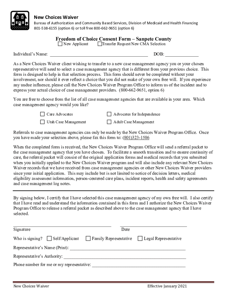 Get the free New Choices Waiver Freedom of Choice Consent Form Sanpete ...