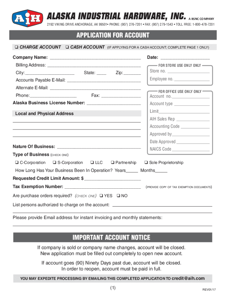 ALASKA INDUSTRIAL HARDWARE, INC. A SNC COMPANY2192 VIKING DRIVE ANCHORAGE, AK 99501 PHONE: (907) 2767201 FAX: (907) 2791543 TOLL FREE: 18004787201APPLICATION FOR ACCOUNT q CHARGE Account CASH ACCOUNT(IF