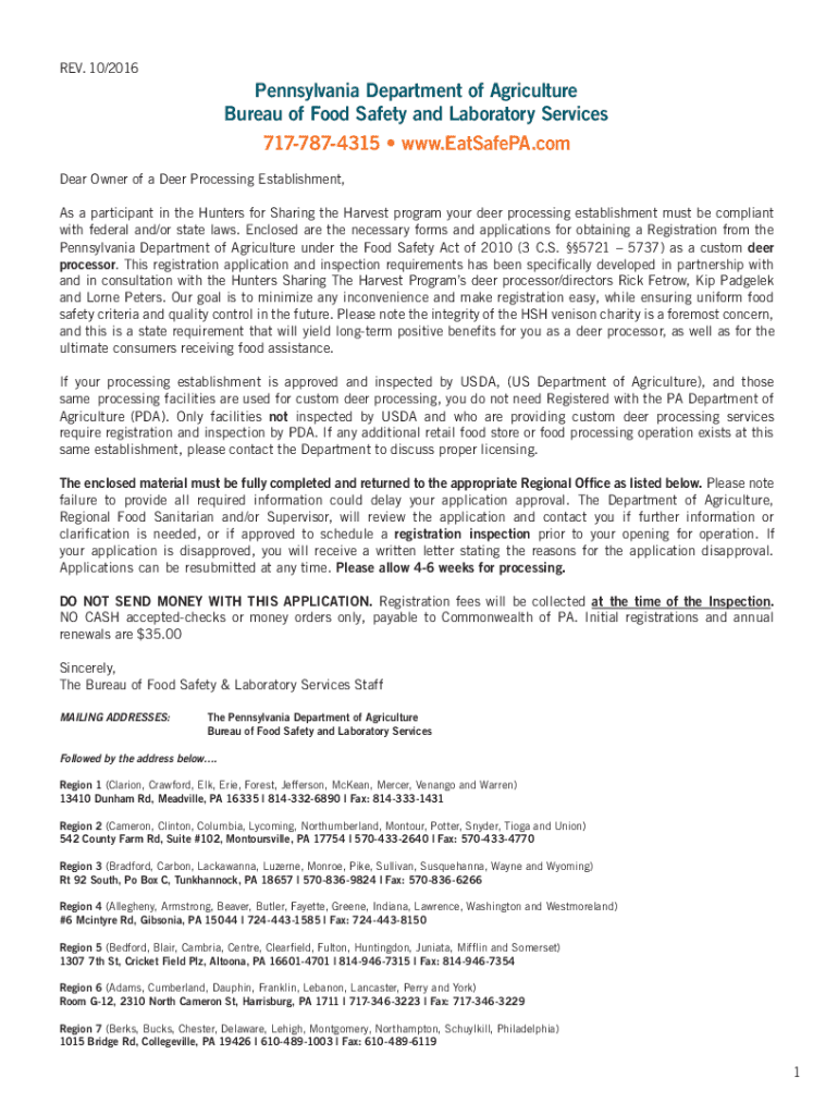 REV. 10/2016Pennsylvania Department of Agriculture Bureau of Food Safety and Laboratory Services 7177874315 www.EatSafePA.com Dear Owner of a Deer Processing Establishment, As a participant in the