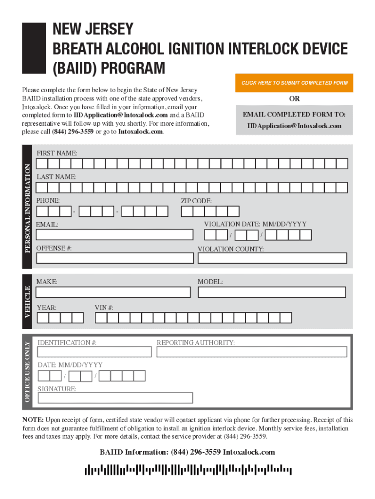NEW JERSEY BREATH ALCOHOL IGNITION INTERLOCK DEVICE (BAIRD) PROGRAM CLICK HERE SUBMIT COMPLETED FORM CLICK HERE TO SUBMIT Formulas complete the form below to begin the State of New Jersey BAIRD installation