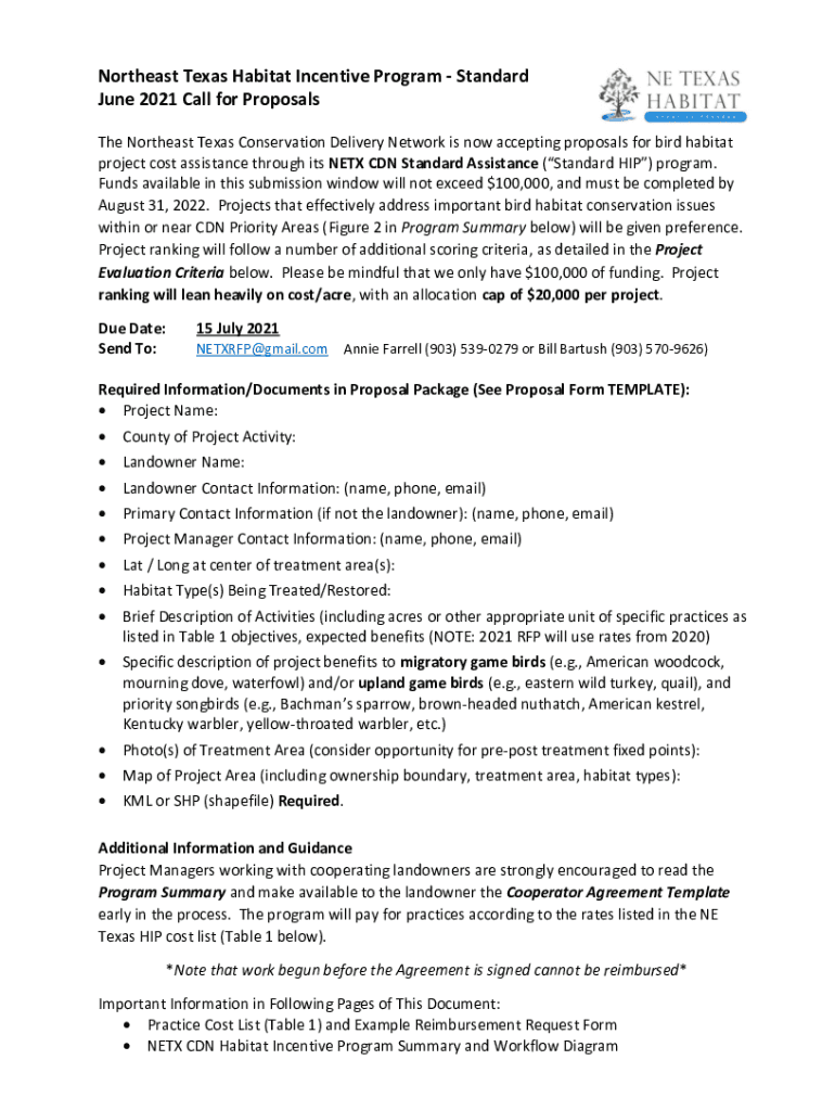 Northeast Texas Habitat Incentive Program Standard June 2021 Call for Proposals The Northeast Texas Conservation Delivery Network is now accepting proposals for bird habitat project cost assistance