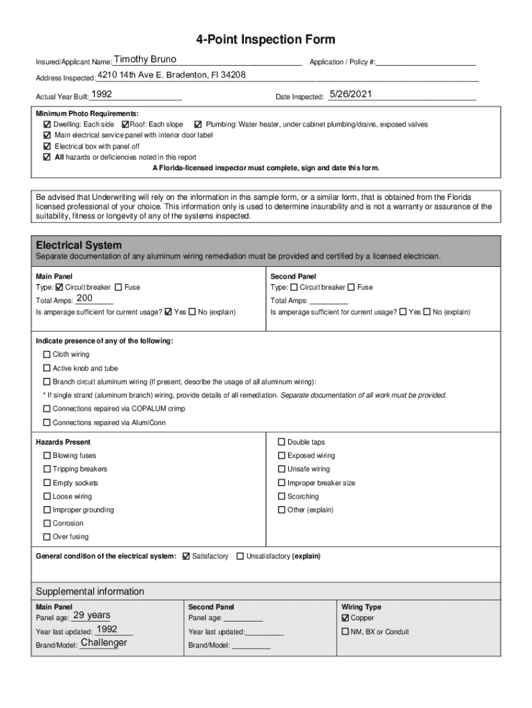 4Point Inspection Form Timothy Bruno Insured/Applicant Name:___Application / Policy #:___4210 14th Ave E. Bradenton, Fl 34208 Address Inspected:___1992 Actual Year Built:___Date Inspected:Minimum