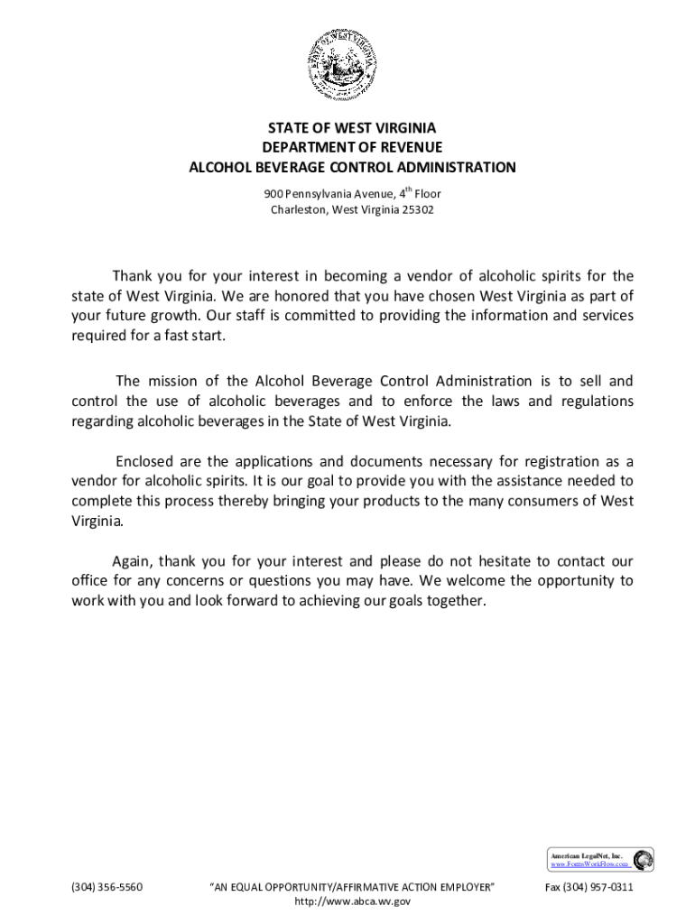 STATEOFWESTVIRGINIA DEPARTMENTOFREVENUE ALCOHOLBEVERAGECONTROLADMINISTRATION 900PennsylvaniaAvenue,4thFloor Charleston,WestVirginia25302 Thank you for your interest in becoming a vendor of alcoholic