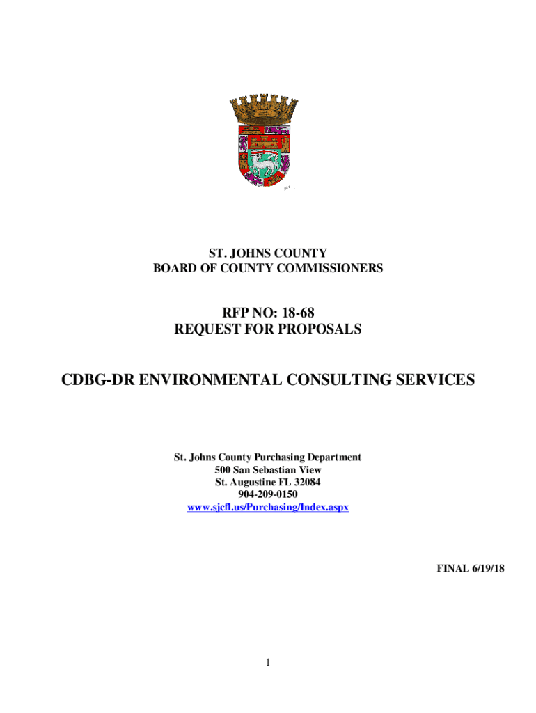 ST. JOHNS COUNTY BOARD OF COUNTY COMMISSIONERS RFP NO: 1868 REQUEST FOR PROPOSALSCDBGDR ENVIRONMENTAL CONSULTING SERVICES St. Johns County Purchasing Department 500 San Sebastián View St. Augustine