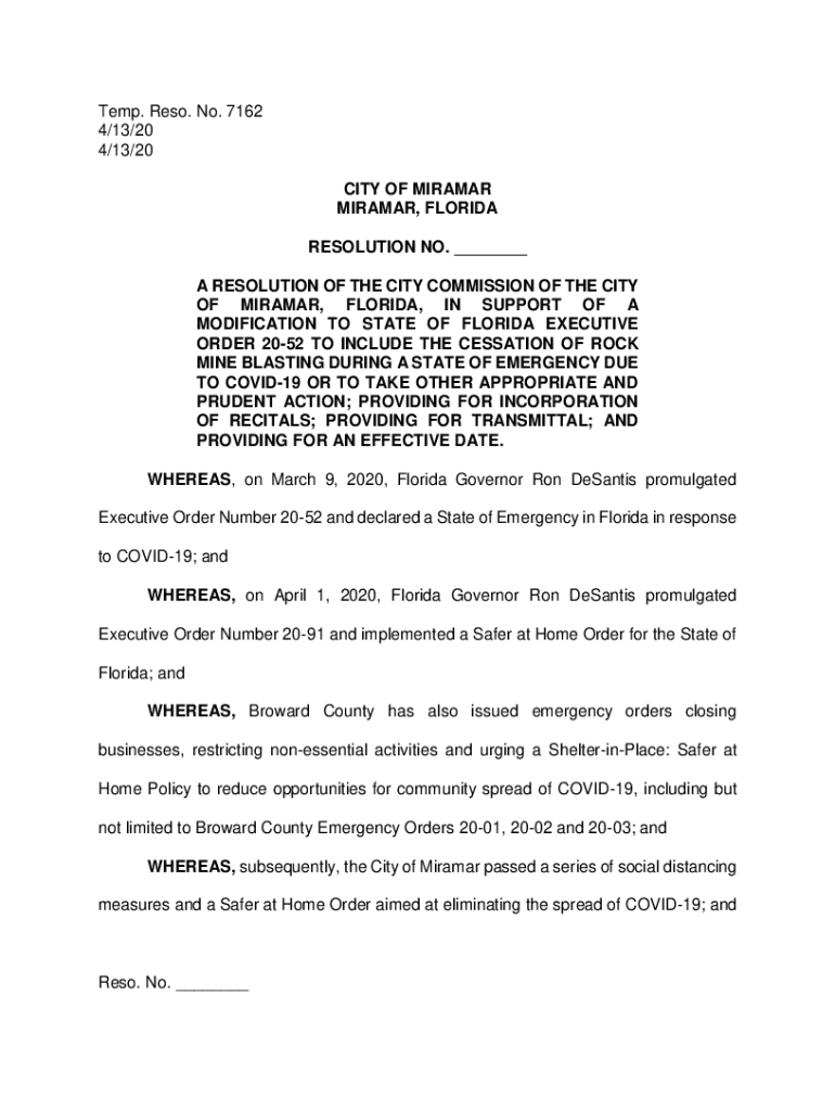 Temp. Rest. No. 7162 4/13/20 4/13/20 CITY OF MIRAMAR, FLORIDA RESOLUTION NO. ___ A RESOLUTION OF THE CITY COMMISSION OF THE CITY OF MIRAMAR, FLORIDA, IN SUPPORT OF A MODIFICATION TO STATE OF FLORIDA