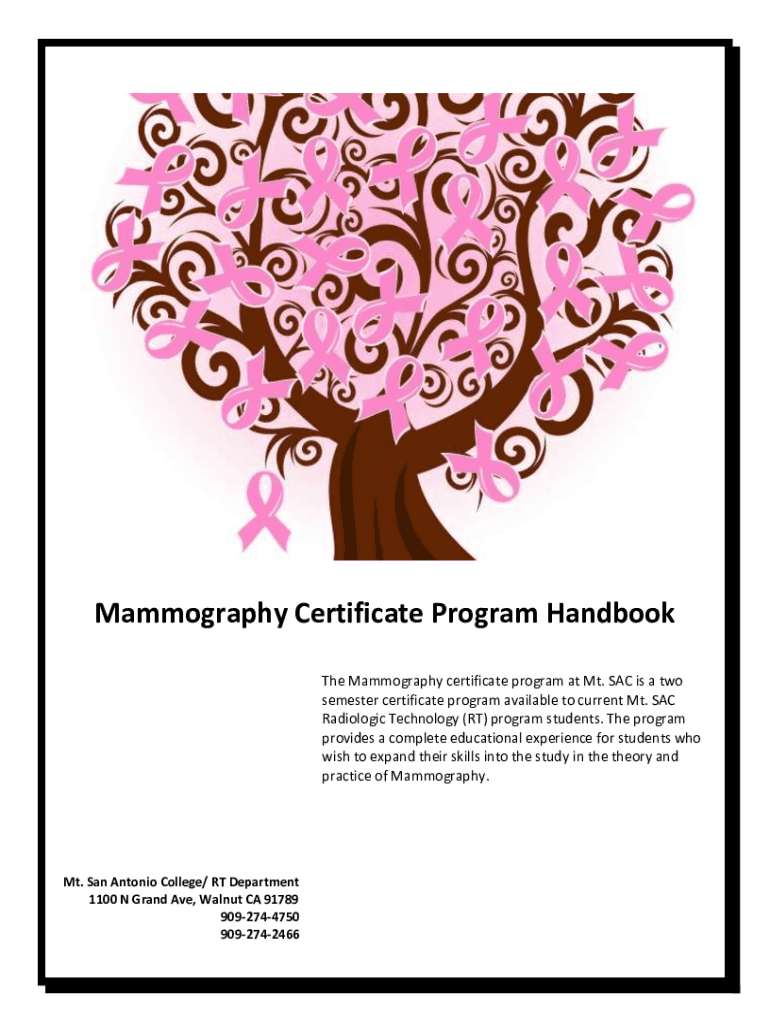 Mammography Certificate Program Handbook The Mammography certificate program at Mt. SAC is a two semester certificate program available to current Mt. SAC Radiologic Technology (RT) program students.