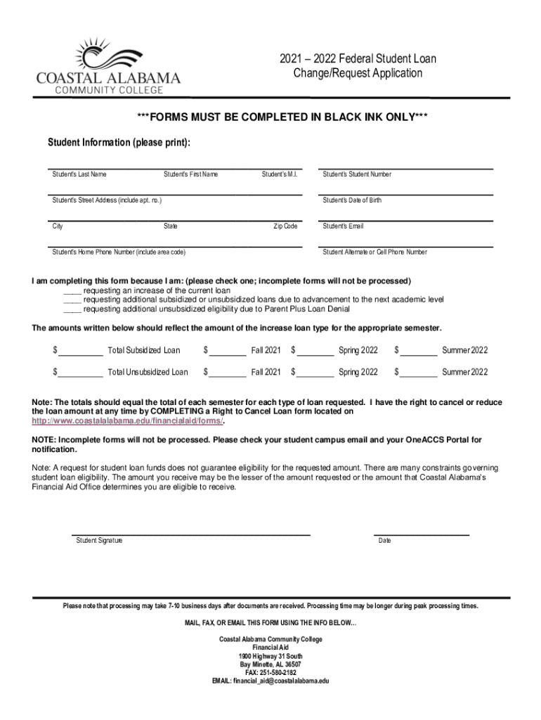 2021 2022 Federal Student Loan Change/Request Application***FORMS MUST BE COMPLETED IN BLACK INK ONLY*** Student Information (please print): Students Last NameStudents First NameStudents M.I. Students