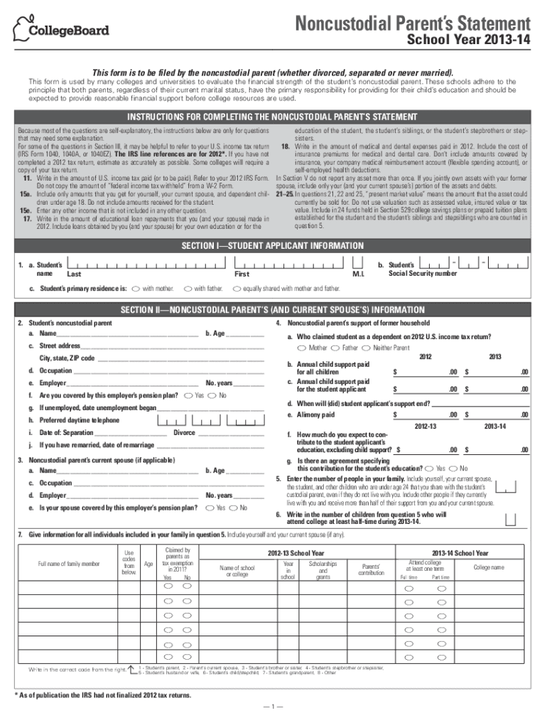 Noncustodial Parents StatementSchool Year 201314This form is to be filed by the noncustodial parent (whether divorced, separated or never married). This form is used by many colleges and universities