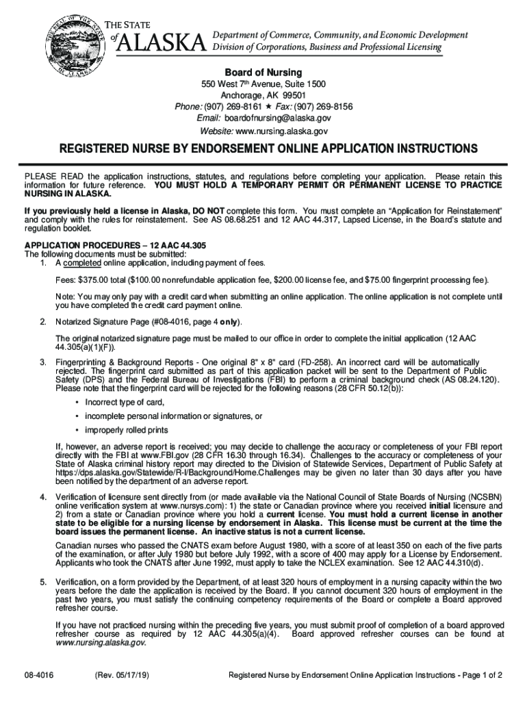 THE STATEALASKAofDepartment of Commerce, Community, and Economic Development Division of Corporations, Business and Professional Licensing Board of Nursing550 West 7th Avenue, Suite 1500 Anchorage,