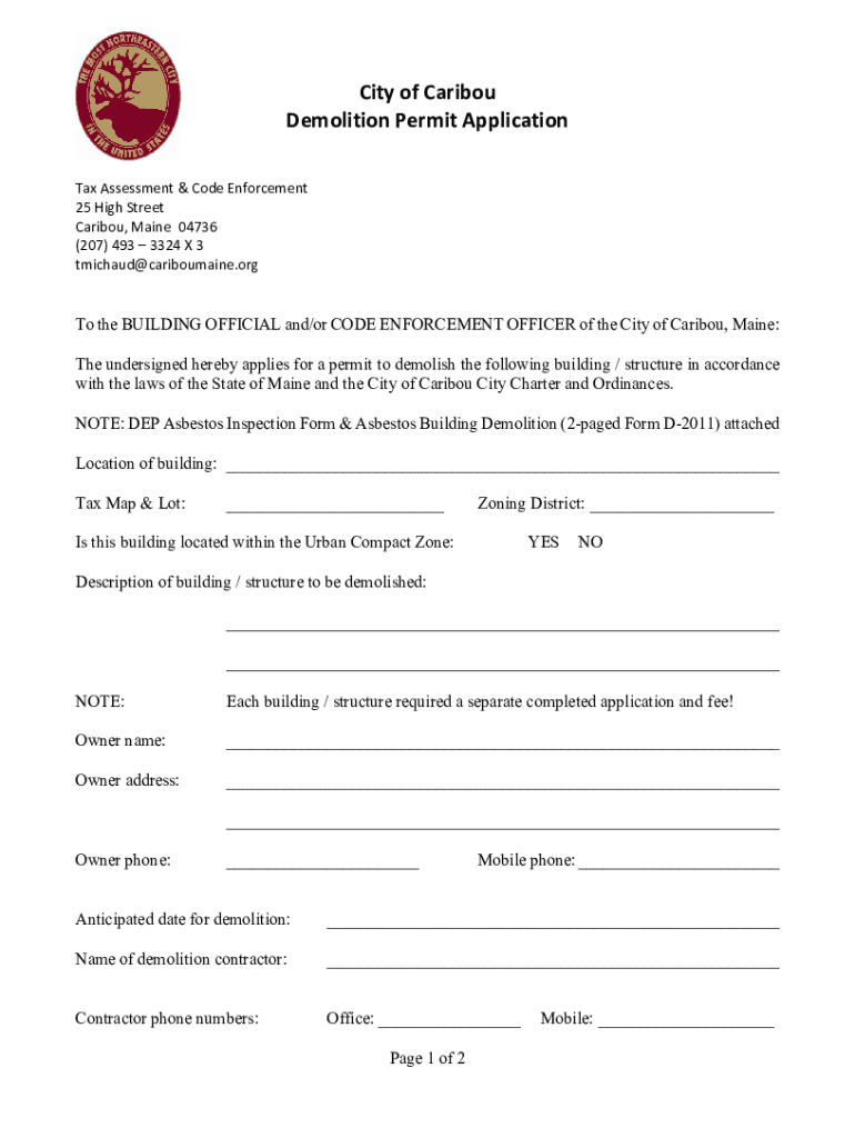 City of Caribou Demolition Permit Application Tax Assessment & Code Enforcement 25 High Street Caribou, Maine 04736 (207) 493 3324 × 3 tmichaud@cariboumaine.orgTo the BUILDING OFFICIAL and/or CODE