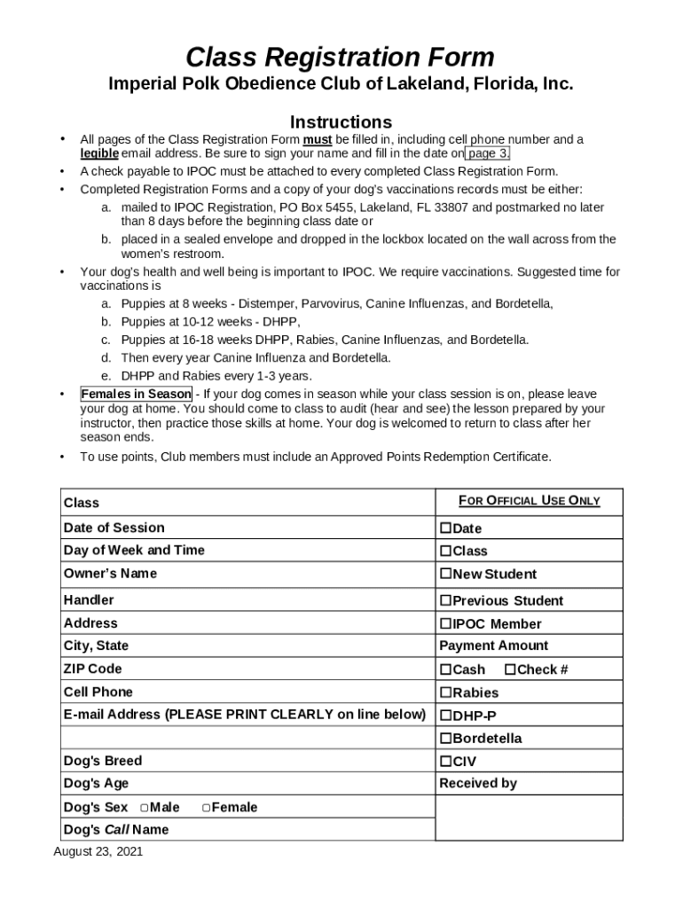 Class Registration Form Imperial Polk Obedience Club of Lakeland, Florida, Inc. Instructions All pages of the Class Registration Form must be filled in, including cell phone number and a legible email