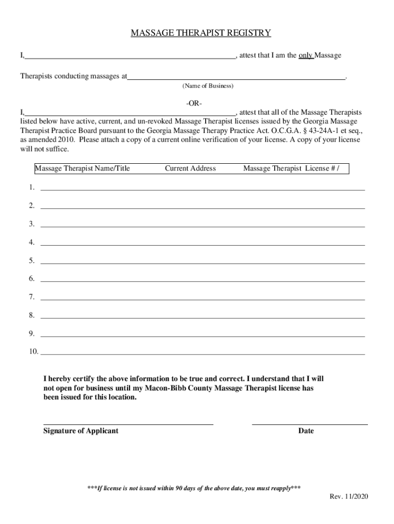 MASSAGE THERAPIST REGISTRY I, attest that I am the only MassageTherapists conducting massages at. (Name of Business)ORI, attest that all the Massage Therapists listed below have active, current, and