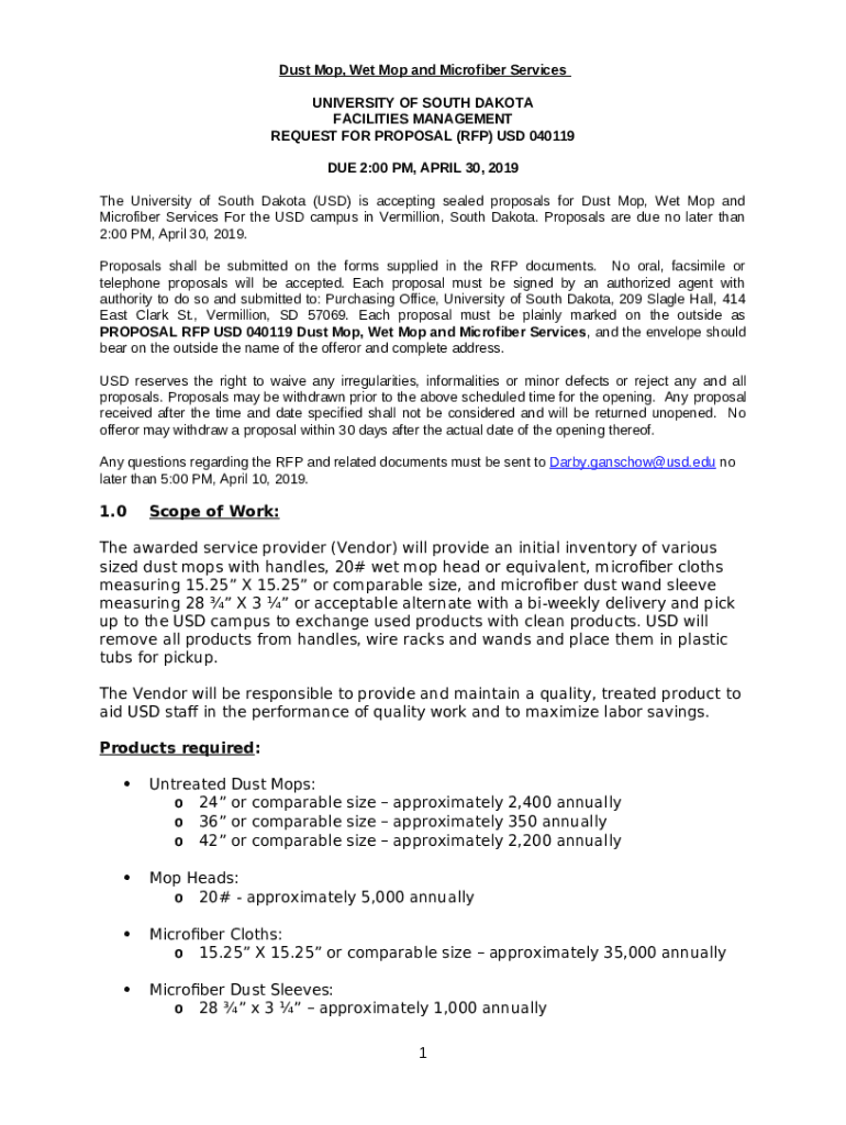 The www.bidnetdirect.comsouth-dakotasolicitationsDust Mop, Wet Mop And Microfiber Services - Bid Ination ... is a document that should be submitted to the required address in order to provide some info. It has to be filled-out and signed, which may be done in hard copy, or using a particular software such as PDFfiller. This tool helps to fill out any PDF or Word document directly in your browser, customize it depending on your purposes and put a legally-binding electronic signature. Right away after completion, user can easily send the www.bidnetdirect.comsouth-dakotasolicitationsDust Mop, Wet Mop And Microfiber Services - Bid Ination ... to the appropriate individual, or multiple recipients via email or fax. The template is printable too due to PDFfiller feature and options offered for printing out adjustment. Both in digital and physical appearance, your form will have got neat and professional outlook. It's also possible to save it as the template to use later, so you don't need to create a new file from the beginning. All you need to do is to customize the ready sample.