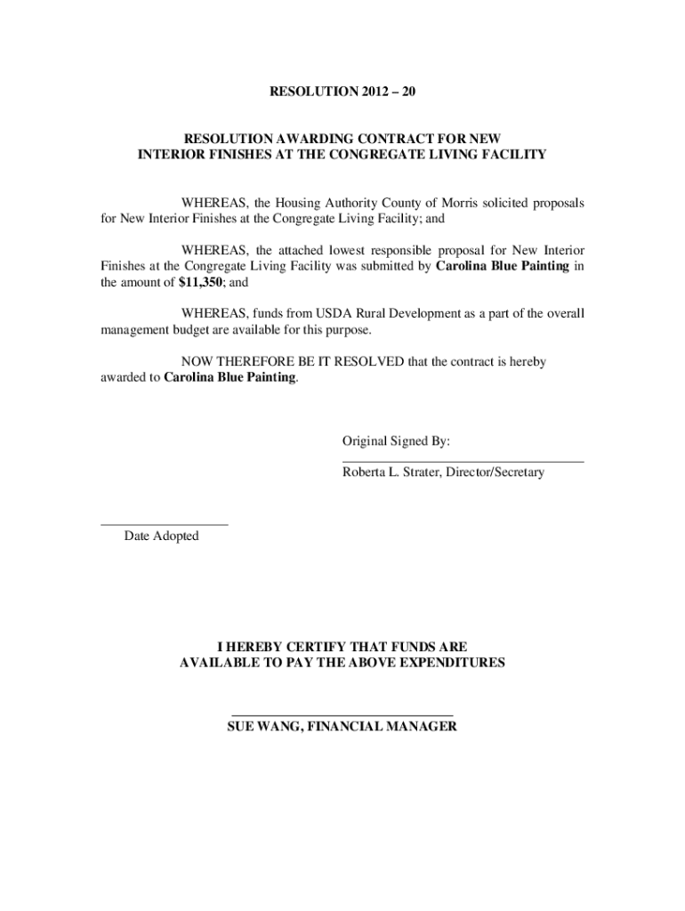 RESOLUTION 2012 20RESOLUTION AWARDING CONTRACT FOR NEW INTERIOR FINISHES AT To CONGREGATE LIVING FACILITYWHEREAS, the Housing Authority County of Morris solicited proposals for New Interior Finishes