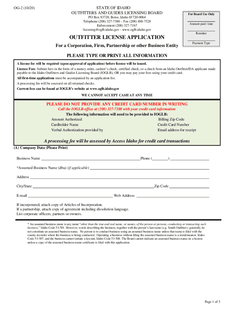 STATE OF IDAHO OUTFITTERS AND GUIDES LICENSING BOARDOG2 (10/20)For Board Use Only PO Box 83720, Boise, Idaho 837200064 Telephone (208) 3277380 Fax (208) 4887528 Enforcement (208) 3277167 licensing@oglb.idaho.gov