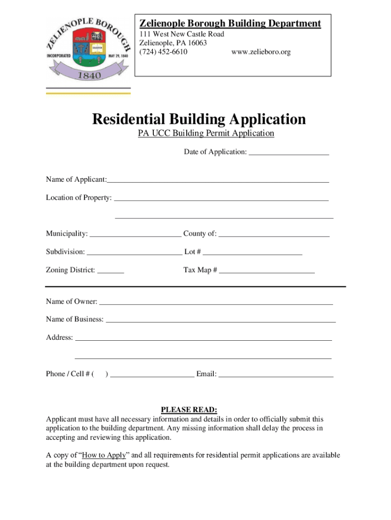 Zelienople Borough Building Department 111 West New Castle Road Zelienople, PA 16063 (724) 4526610 www.zelieboro.orgResidential Building Application PA UCC Building Permit Application Date of Application: