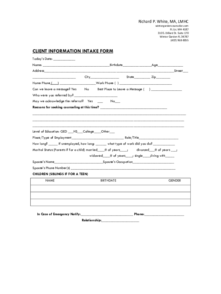 Richard P. White, MA, MHC wintergardencounselor.com FL LIC. MH 4187 310 S. Dillard St. Suite 170 Winter Garden FL 34787 (407) 9688055CLIENT INFORMATION INTAKE FORM Today's Date: ___ Name: ___Birthdate___Age___