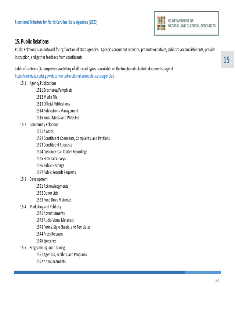 Functional Schedule for North Carolina State Agencies (2020)15. Public Relations is an outward facing function of state agencies. Agencies document activities, promote initiatives, publicize accomplishments,