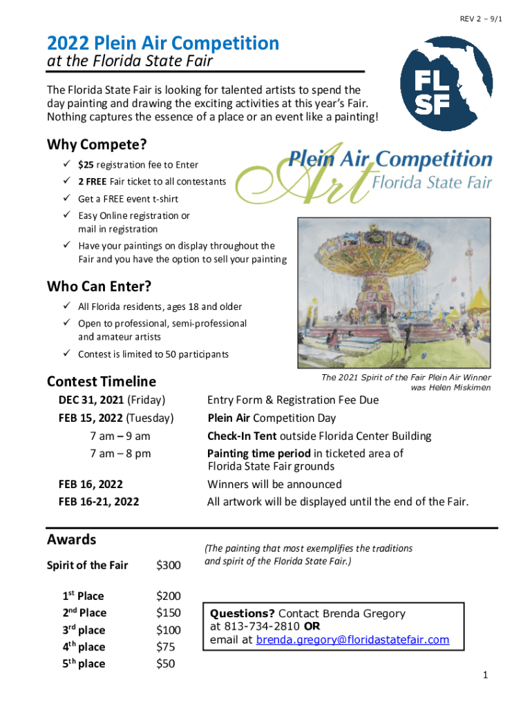 REV 2 9/12022 Plan Air Competition at the Florida State Faith Florida State Fair is looking for talented artists to spend the day painting and drawing the exciting activities at this year's Fair.