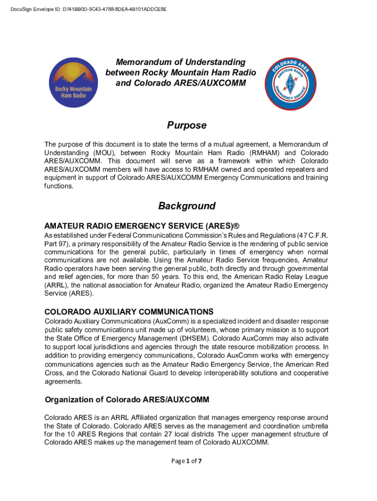 DocuSign Envelope ID: D741BB0D9C4347888DEA4B101ADDCE8EMemorandum of Understanding between Rocky Mountain Ham Radio and Colorado ARES/AUXCOMMPurpose The purpose of this document is to state the terms