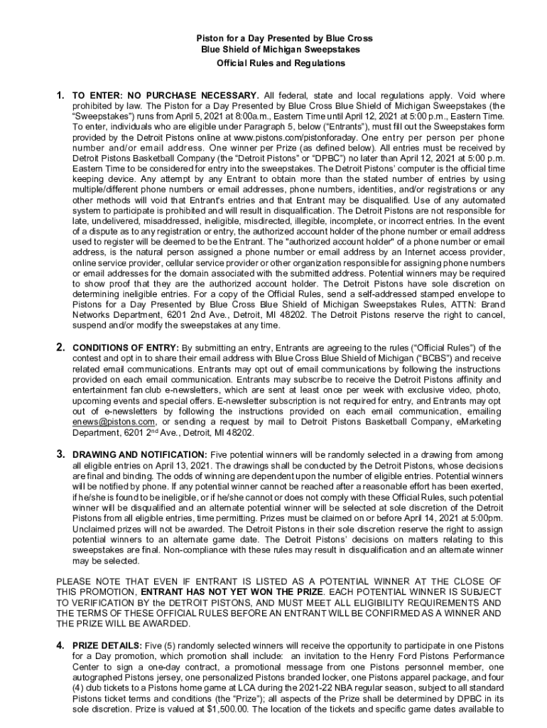 Piston for a Day Presented by Blue Cross Blue Shield of Michigan Sweepstakes Official Rules and Regulations1. TO ENTER: NO PURCHASE NECESSARY. All federal, state and local regulations apply. Void