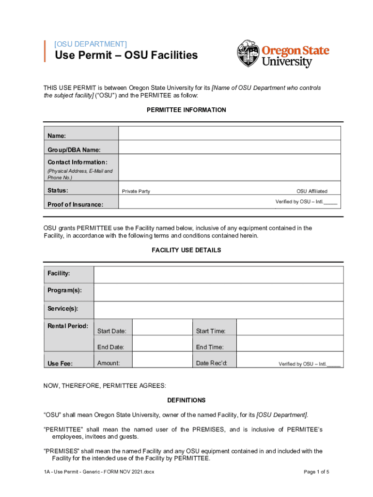 [OSU DEPARTMENT]Use Permit OSU Facilities THIS USE PERMIT is between Oregon State University for its [Name of OSU Department who controls the subject facility] (OSU) and the PERMIT EE as follows: