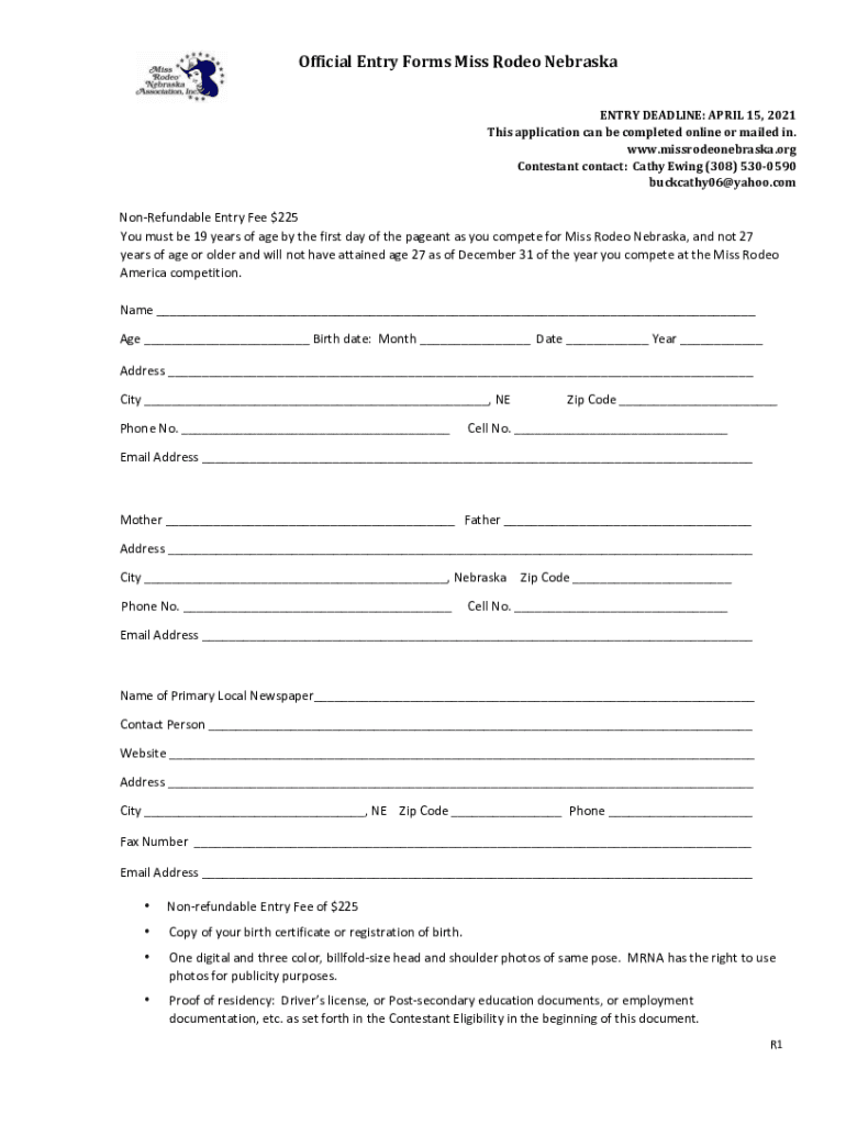 Official Entry Forms Miss Rodeo Nebraska ENTRY DEADLINE: APRIL 15, 2021, This application can be completed online or mailed in. www.missrodeonebraska.org Contestant contact: Cathy Ewing (308) 5300590
