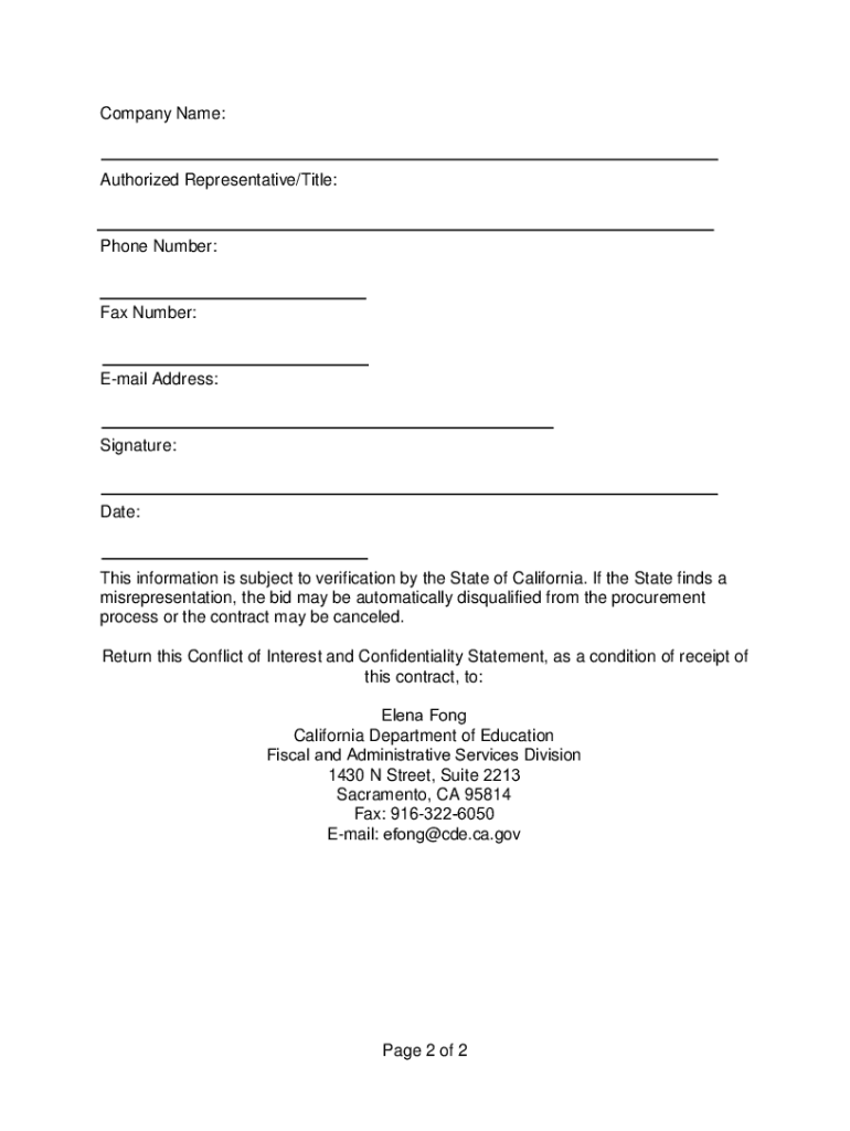 California Department of Education Request for Proposal (RFP) Number CN190007 ATTACHMENT 12CONFLICT OF INTEREST AND CONFIDENTIALITY STATEMENT I certify that I/We have no personal or financial interests
