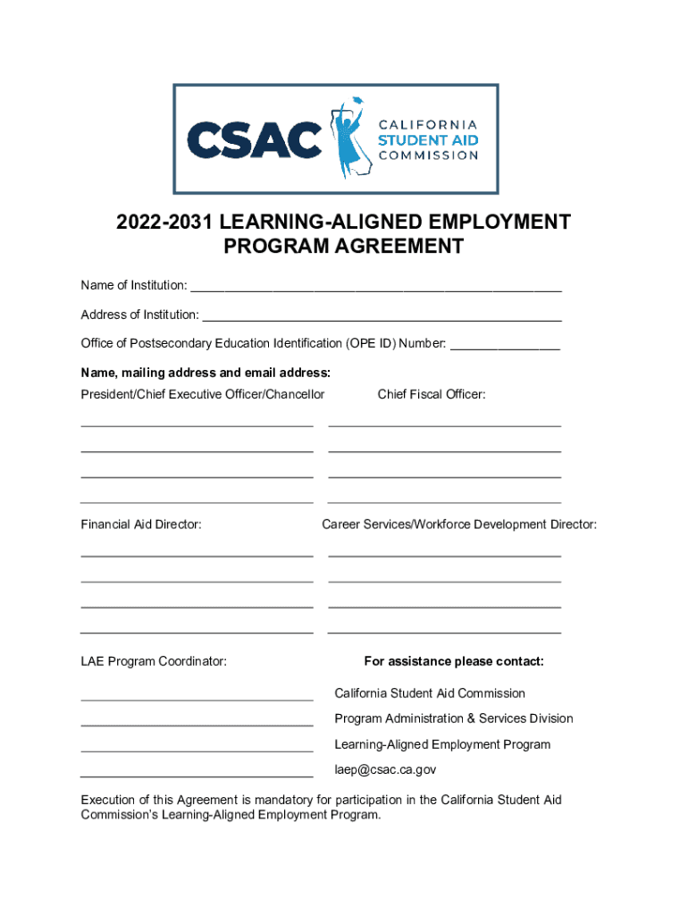 CSACCALIFORNIASTUDENT AID COMMISSION20222031 LEARNINGALIGNED EMPLOYMENT PROGRAM AGREEMENT Name of Institution: ___ Address of Institution: ___ Office of Postsecondary Education Identification (OPE