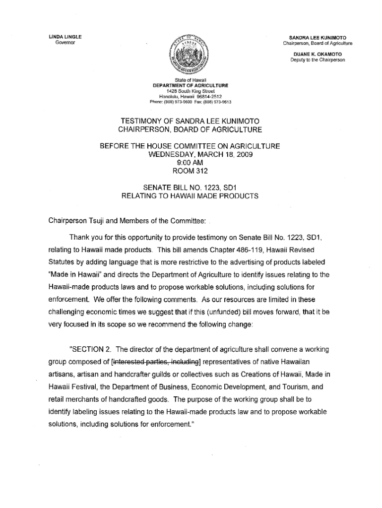 LINDA SINGLE GovernorSANDRA Lee KIMONO Chairperson, Board of Agriculture DUANE K. NAKAMOTO Deputy to the ChairpersonState of Hawaii DEPARTMENT OF AGRICULTURE 1428 South King Street Honolulu, Hawaii