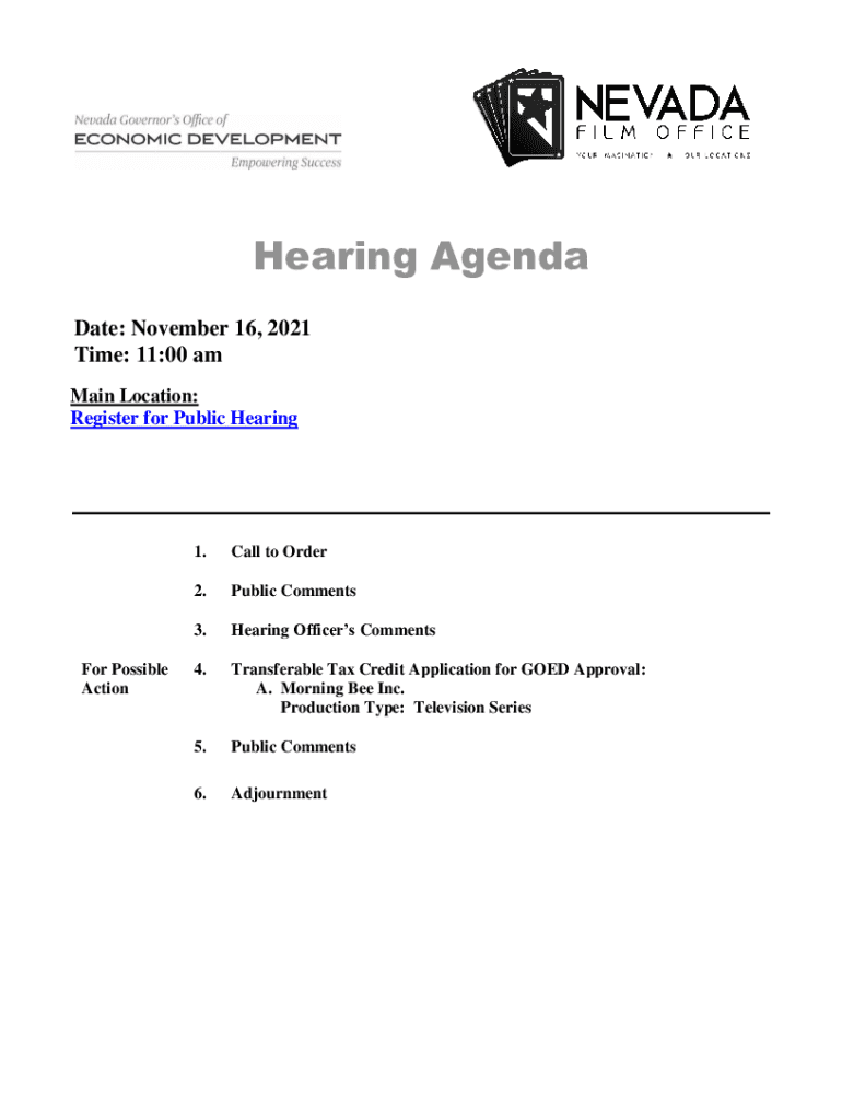 Hearing Agenda Date: November 16, 2021, Time: 11:00 am Main Location: Register for Public Hearing Possible Action1. Call to Order2. Public Comments3. Hearing Officers Comments4. Transferable Tax Credit
