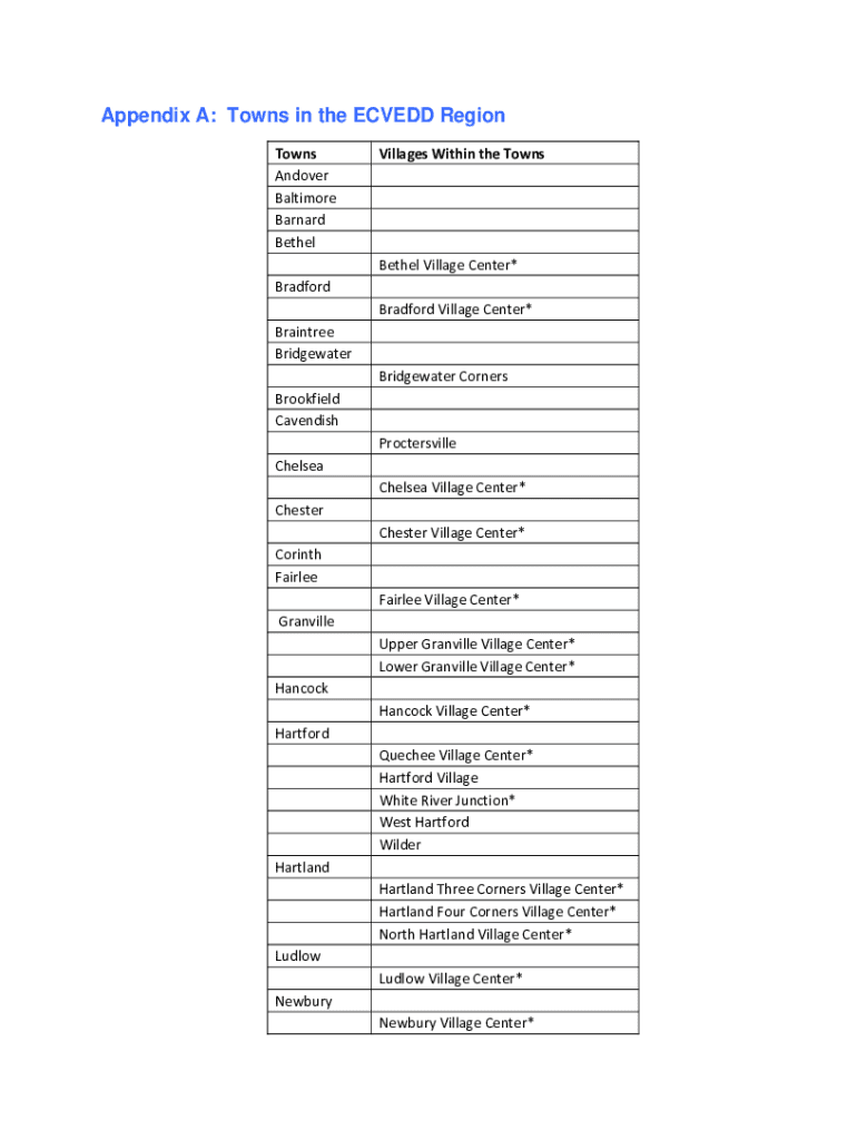 Appendix A: Towns in the EVEN Region Towns Andover Baltimore Barnard BethelVillages Within the TownsBethel Village Center* Bradford Village Center* Braintree Bridgewater Corners Brookfield Cavendish