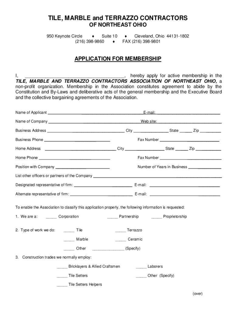 TILE, MARBLE and TERRAZZO CONTRACTORS OF NORTHEAST OHIO 950 Keynote Circle Suite 10 (216) 3989860 Cleveland, Ohio 441311802 FAX (216) 3989801APPLICATION FOR MEMBERSHIP I, ___, hereby apply for active