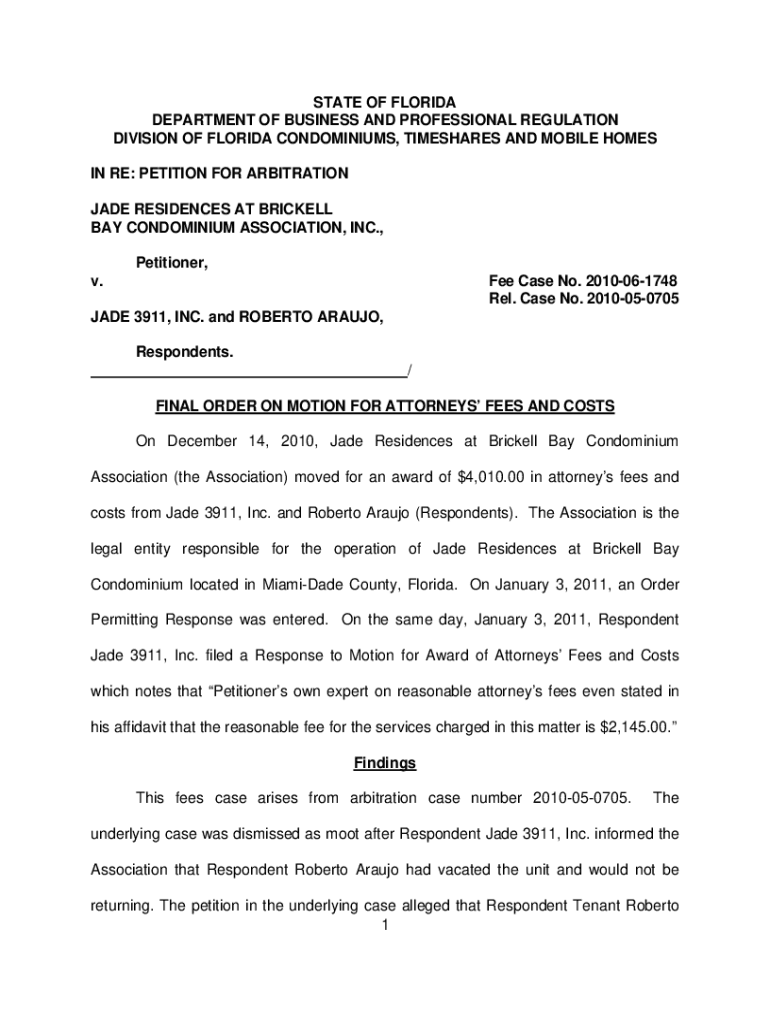 STATE OF FLORIDA DEPARTMENT OF BUSINESS AND PROFESSIONAL REGULATION DIVISION OF FLORIDA CONDOMINIUMS, TIMESHARES AND MOBILE HOMES IN RE: PETITION FOR ARBITRATION JADE RESIDENCES AT BRICKED BAY CONDOMINIUM