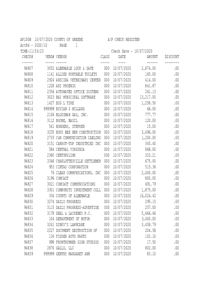 Get the free www.greenecountyva.govgovernmentdeptsAP100B 10/07/2020 COUNTY OF GREENE A/P CHECK RE...